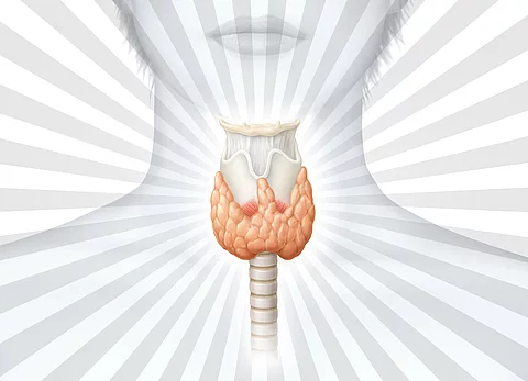 Grafische Darstellung des Halsbereichs mit hervorgehobener Schilddrüse in Orange, umgeben von strahlenförmigen Linien.