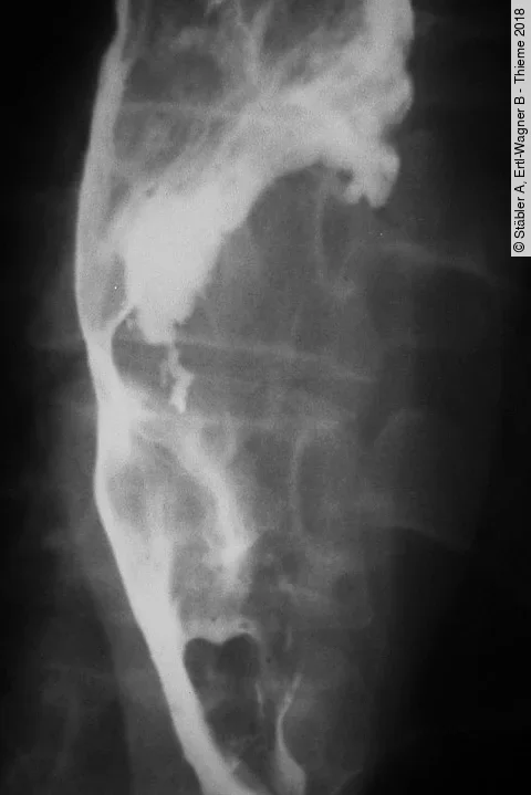 Quiz: Auflösung: 68-Jähriger mit SchluckbeschwerdenStäbler A, Ertl-Wagner B - Thieme 2018Stäbler A, Ertl-Wagner B - Thieme 2018Der Patient hat ein Leiomyosarkom des Ösophagus.