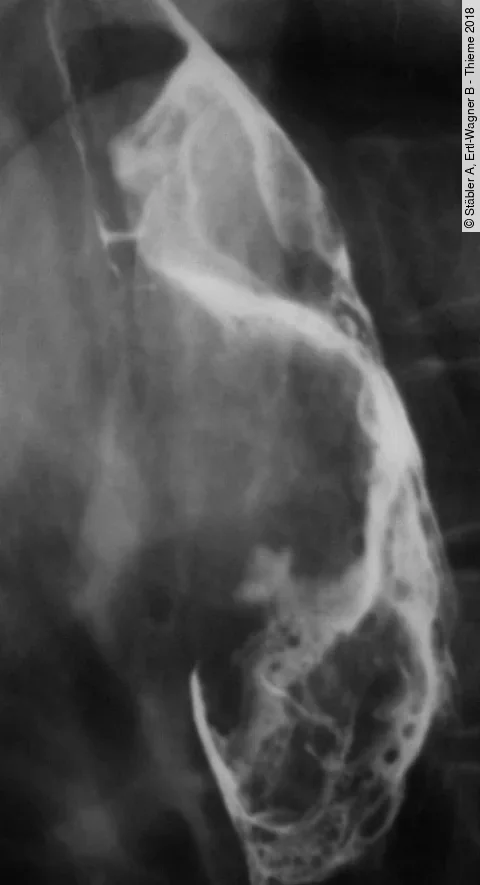 Ein 68-Jähriger stellt sich mit seit längerem bestehenden Schluckbeschwerden vor. Sie führen eine Barium-Breischluck-Untersuchung durch. Was sehen Sie auf den Bildern?