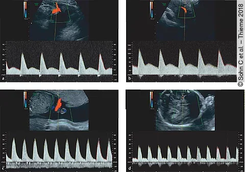 Bei 20 SSW lagen die fetalen Maße um die 20. Perzentile. Die Widerstände erkennen Sie in der Doppler-Bildergalerie, sodass eine Kontrolle bei 24 SSW erfolgte.
